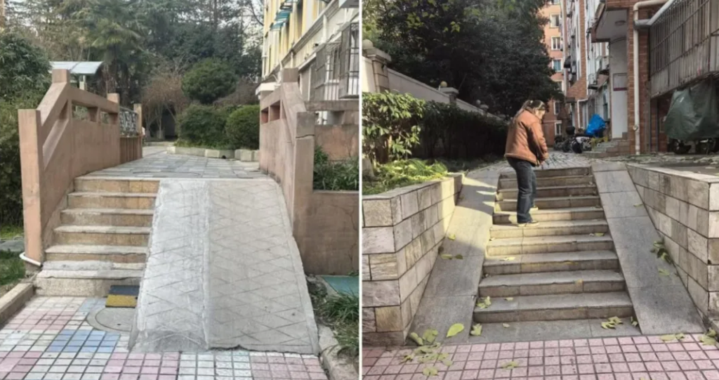 梅花山莊02C幢和20幢旁的大坡,坡度較陡,一直是周邊老年居民出行的一大難題。平日里,老人們上下坡就得小心翼翼,而遇到雨雪天氣,路面濕滑不堪,安全隱患更是成倍增加,讓老人們出行時提心吊膽。
